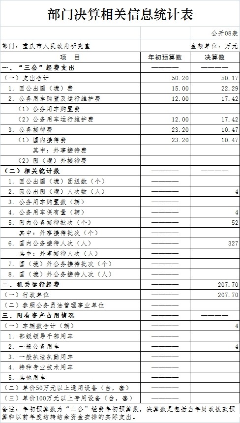 (七)“三公”经费:指用一般公共预算财政拨款安排的因公出国(境)费、公务用车购置及运行维护费、公务接待费。其中,因公出国(境)费反映单位公务出国(境)的国际旅费、国外城市间交通费、住宿费、伙食费、培训费、公杂费等支出;公务用车购置费反映单位公务用车购置支出(含车辆购置税);公务用车运行维护费反映单位按规定保留的公务用车燃料费、维修费、过路过桥费、保险费、安全奖励费用等支出;公务接待费反映单位按规定开支的各类公务接待(含外宾接待)支出。