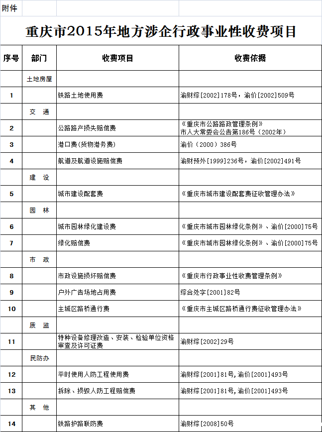 根据国家法律法规和《财政部、国家发展改革委、工业和信息化部关于开展涉企收费专项清理规范工作的通知》(财税〔2015〕45号)要求,我局编制了《重庆市2015年地方涉企行政事业性收费目录清单》,现予以公布。 附件:重庆市2015年地方涉企行政事业性收费目录清单