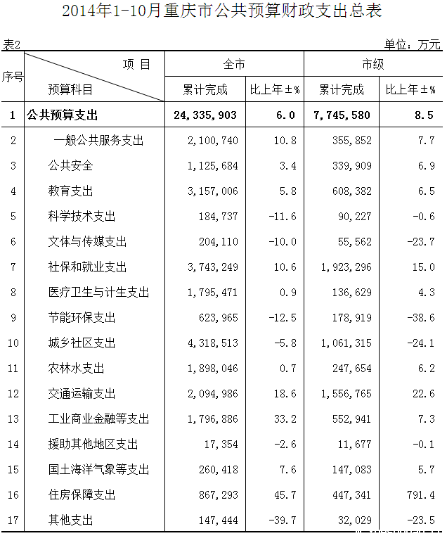 支出方面:今年以来,全市财政部门面对日益突出的收支矛盾,主动谋划,厉行节约,统筹全局,在严控一般性开支的同时,较好保障了民生、法定和重点支出。全市公共财政预算支出完成2433.6亿元,增长6.0%。其中:教育支出完成315.7元,增长5.8%;社会保障和就业支出完成374.3亿元,增长10.6%;交通运输支出完成209.5亿元,增长18.6%;工业商业金融等支出完成179.7亿元,增长33.2%;住房保障支出完成86.7亿元,增长45.7%。