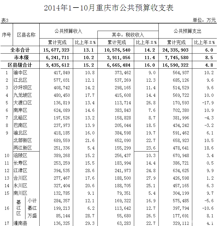 ——区县级收入形势总体好于市级。区县级公共财政预算收入增长15.2%,高于市级增速5.0个百分点,其中税收收入增长16.0%,高于市级增速4.6个百分点。